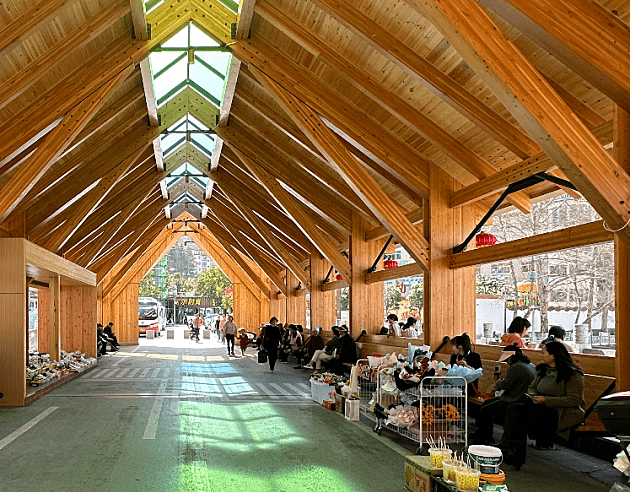 The roof was fully prefabricated over the course of a year, with construction divided into 18 pieces called “cassettes.” Each cassette includes mass timber and steel superstructure, skylights up to 70 ft long by 30 ft wide, insulation, mechanical components, and finishes. After prefabrication completion, the cassettes, the largest of which is 220 ft by 110 ft, were installed over several nights in 2022 during a four-hour window when there were no passengers or occupants below the construction area.