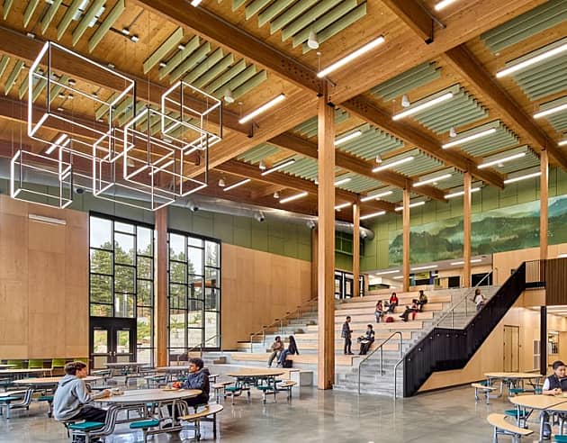 Le nouveau bâtiment académique de 15 000 pieds carrés est ancré à l'extrémité nord du site de huit acres. Un espace lumineux à double hauteur constitue le centre collectif du bâtiment, avec des vues sur l'extérieur à travers un grand mur de verre et une porte basculante qui s'ouvre sur des jardins de démonstration au sud. Le bâtiment abrite des zones d'apprentissage et de recherche flexibles ainsi que des espaces de travail pour les étudiants, le corps enseignant, le personnel et les partenaires. Le système structurel principal comprend des panneaux de contreplaqué de masse (MPP) et du bois de masse provenant de la région. Une arcade couverte est conçue pour protéger le bâtiment le long de la façade sud avec une structure de toit photovoltaïque qui sert à la fois d'abri et à récolter l'énergie du soleil pour soutenir le bâtiment qui est en voie d'atteindre l'énergie nette zéro.