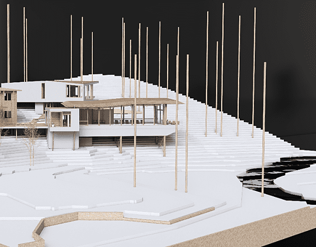Montage du bâtiment : Austrian Mass Timber CLT toit, murs, planchers, structure hybride en acier, triple vitrage allemand pour les unités de fenêtres et la façade de la maison de la piscine, R69 toits, R29 murs, R50 planchers et terrasses, membrane perméable à la vapeur sur toutes les surfaces extérieures, pare-pluie en zinc.